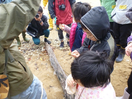 また、講師の島村さんはオカヤドカリに関しても、とても詳しい方です。海岸に生息しているオカヤドカリを探して、オカヤドカリが好む環境や種類の見分け方について解説していただきました。子供たちはオカヤドカリを手に取り、殻にこもってなかなか出てこないオカヤドカリを見ようと頑張って息を吹きかけていましたが、その姿はとてもかわいらしかったです。