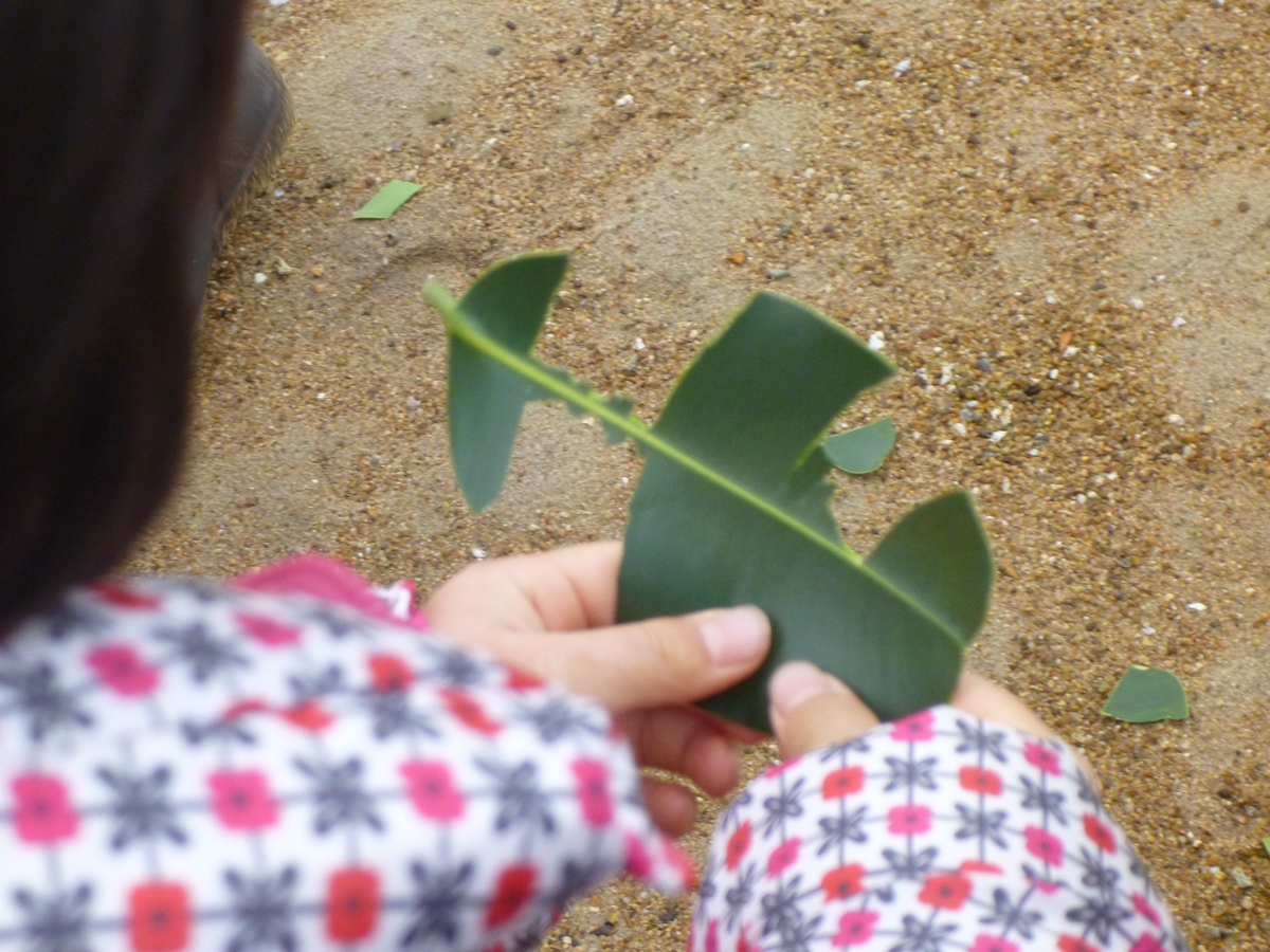 石垣島では、道路沿いの街路樹でよく見かけるテリハボクですが、葉は葉脈に沿ってきれいに手で千切ることができます。その特徴を利用して、島村さんが自宅の畑から採ってきたテリハボクの葉をみなさんに配布し、葉を飛行機の形にかたどり、だれが一番遠くへ飛ばせるか競い合いながら楽しみました。