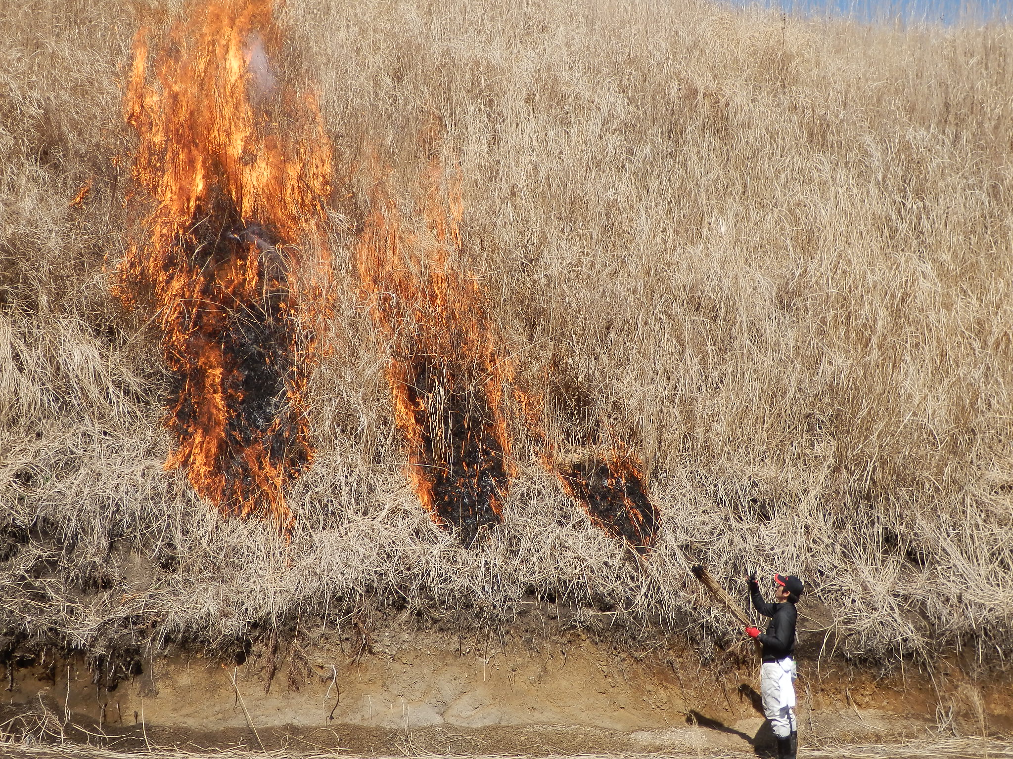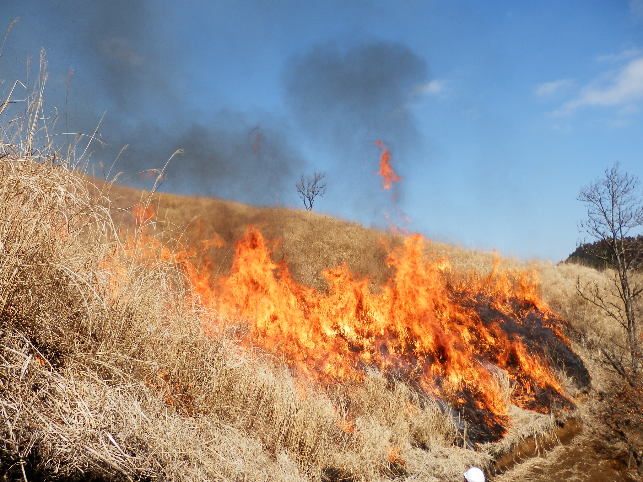 野焼きをすることで芽吹きを助け、採草や放牧に適した新しい草が生えてきます。また草原の森林化や草刈りの時の妨げになる低木類の抑圧にもなるため、ヤブ化を防ぐことにも繫がります。