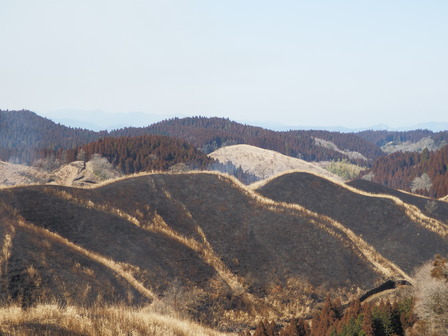 草が焼け、尾根の線がハッキリ見えます。真っ黒になった草原は、春の訪れを心待ちにしているかのようです。