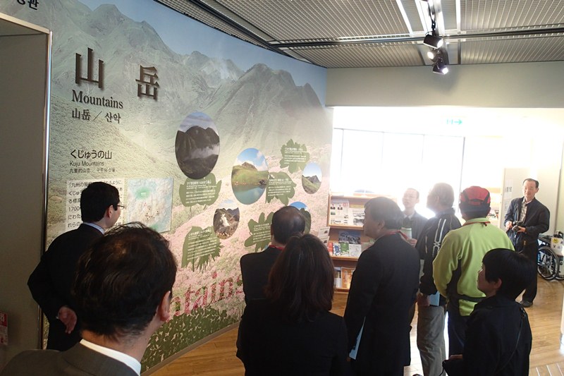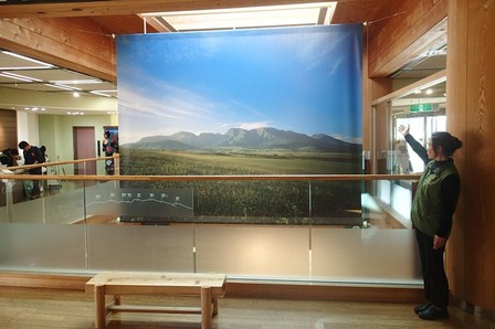 リニューアルの目玉としては、2階入口、正面の吹き抜け部分に巨大シンボルバナーを取り付けたことです。片側からは平治岳から見たくじゅう連山、もう片側からは久住高原から見たくじゅう連山の写真が入っており、まるでそこにいるかのような圧倒的な自然の壮観を体感できるようになっています。