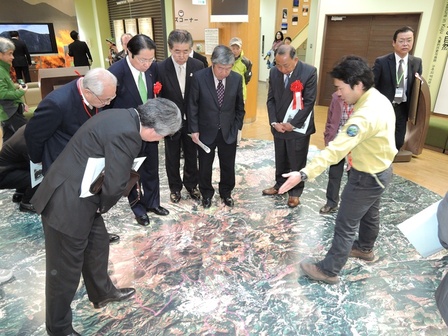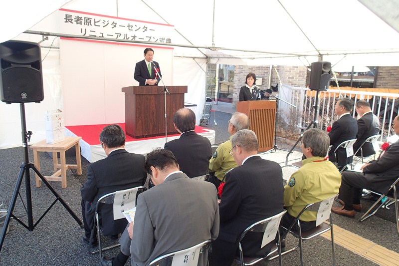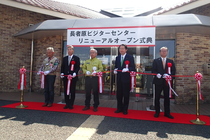 オープンに際して、同日10:00~11:00に長者原ビジターセンターリニューアルオープン式典を執り行いました。テープカットは、衛藤征士郎-衆議院議員、坂本和昭-九重町長、野田良輔-竹田市副市長、渡邊格雄-九重の自然を守る会理事長に加えて、主催者代表として環境省九州地方環境事務所から杉田高行-統括自然保護企画官が行いました。