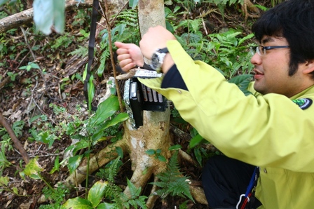 徳之島では、アマミノクロウサギやその他野生生物の生息状況を把握するため平成23年より、山岳部に自動撮影カメラを設置しモニタリング調査を行っています。