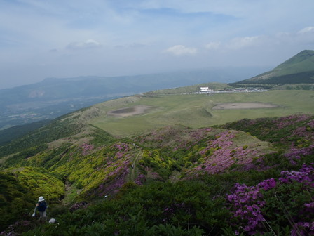 5月中旬 烏帽子岳中腹から見た草千里ヶ浜 ピンクはミヤマキリシマ!