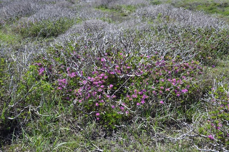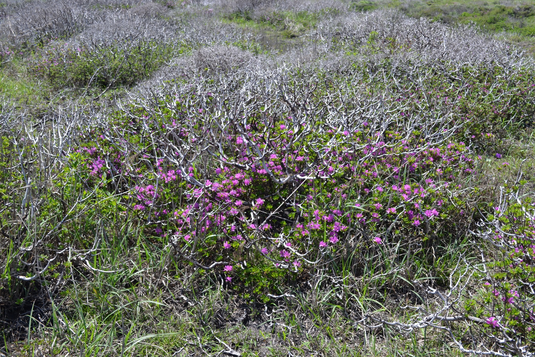 火口と目と鼻の先ほど(火口から1kmちょっと)しか離れておらず、場合によっては噴煙を上げる音が聞こえるくらい噴火を間近に感じることができる場所です。ここも灰やガスの影響が大きく、春先には新芽も出ておらず枯死?のような状況でしたが、この時期になり、親株の脇から出てきた次世代の枝からポツポツと咲き出しました!・・なんだか変わった咲き方でおもしろい、ミヤマキリシマも世代交代でしょうか。