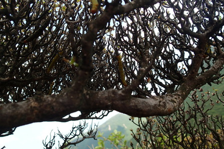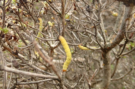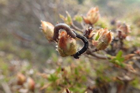 くじゅうのミヤマキリシマは毎年虫害問題に悩まされている現状です。食害する種類としては「キシタエダシャク」、「クジュウフユシャク」というシャクガの幼虫です。食草は主にアセビやツツジ。年によって大量発生することがあり、ミヤマキリシマの葉を食べ尽くし開花に大打撃を与えます。つまるところミヤマキリシマの開花状況はこの虫たちの発生数次第で大きく変化すると考えて良いと思います。