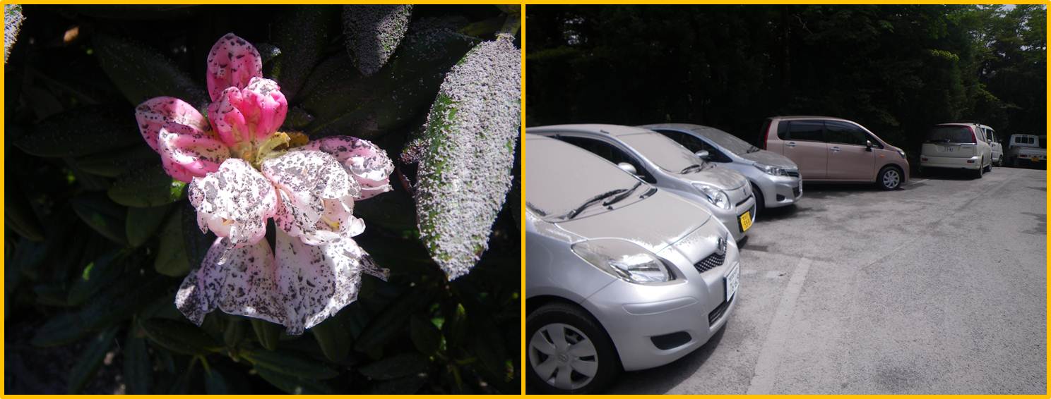 ▲ヤクシマシャクナゲに積もった火山灰と、車や道路に積もった火山灰(淀川登山口)。