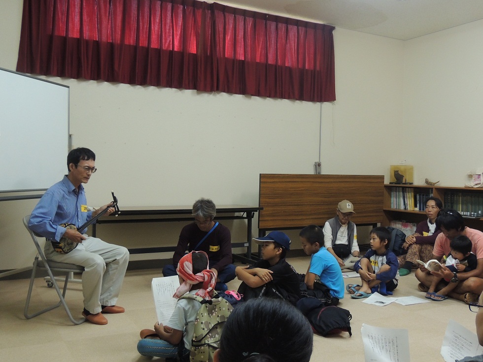 まずは、事前学習として八重山に伝わる民謡「やぐじゃーま節」を聞きました。この民謡は制作当時の人たちの苦しい生活を干潟にすむカニになぞらえて歌っているものです。八重山に伝わっている歌と西表島古見集落に伝わる「やくじゃーま節」とは少し歌詞が違っています。