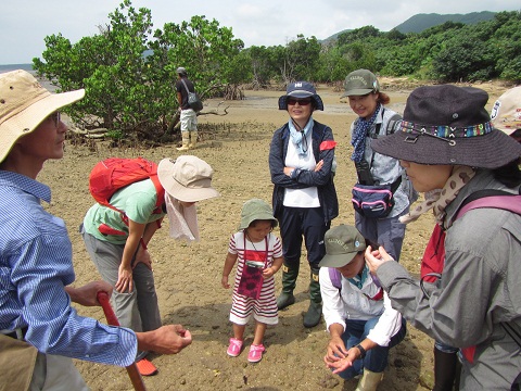 5月31日に西表島干潟観察会~民謡のカニ「やぐじゃーま」へ会いに行こう~を開催しました。西表島の古見集落には「やくじゃーま節」という民謡が伝わっており、歌詞には数種類のカニが登場します。今回はこのカニたちを見に行く観察会です。