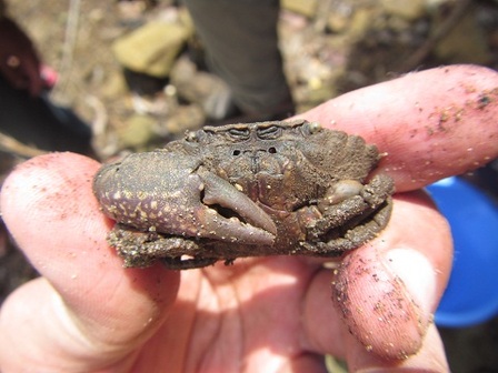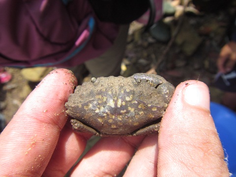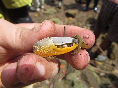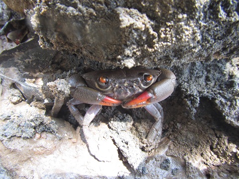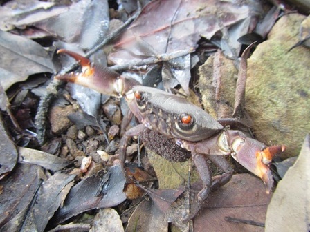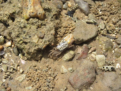 これが、やぐじゃーま(クマドリオウギガニ)です。クマドリオウギガニは、肉食性でほかのカニを襲って食べます。周囲の環境を見てみるとマングローブの落ち葉が堆積しており、これを食べる小型のカニが何種類も居ました。
