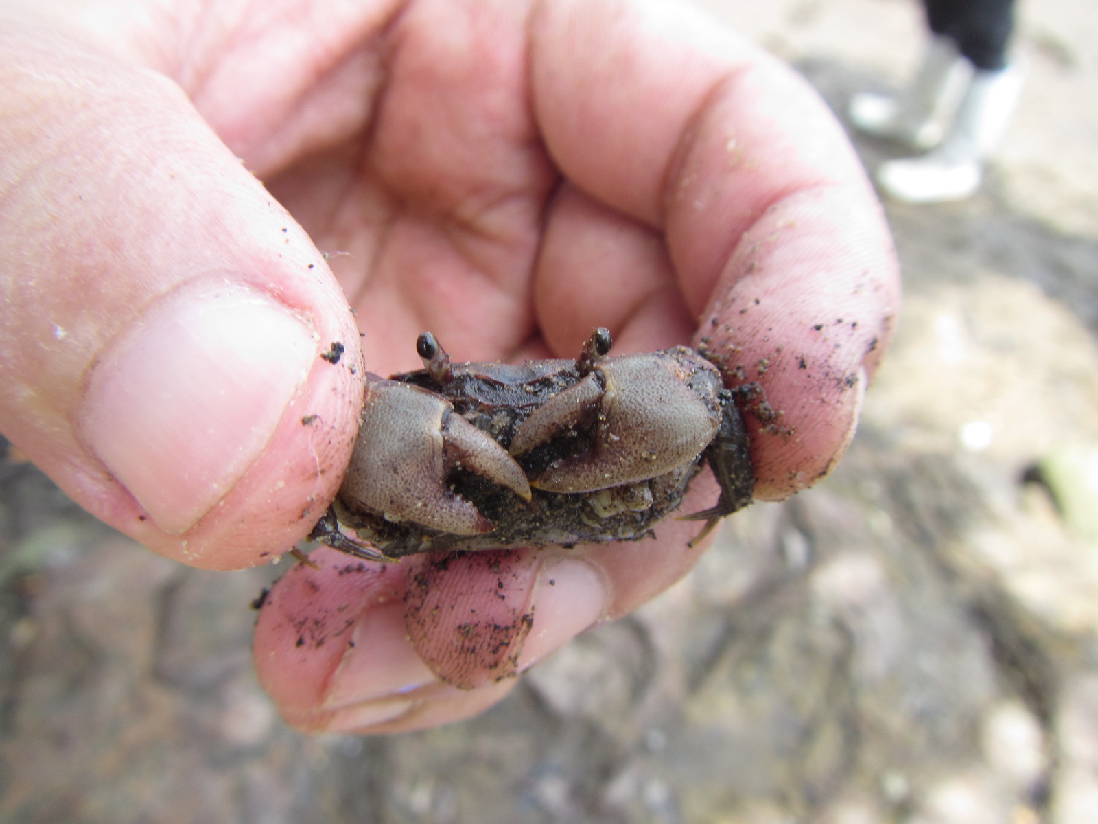次に干潟へ移動して、実際にカニやその他の生き物を探しました。少し歩けば、いろいろな生き物が見つかるため、なかなか前に進みません。それでは、発見したカニをいくつか紹介します。