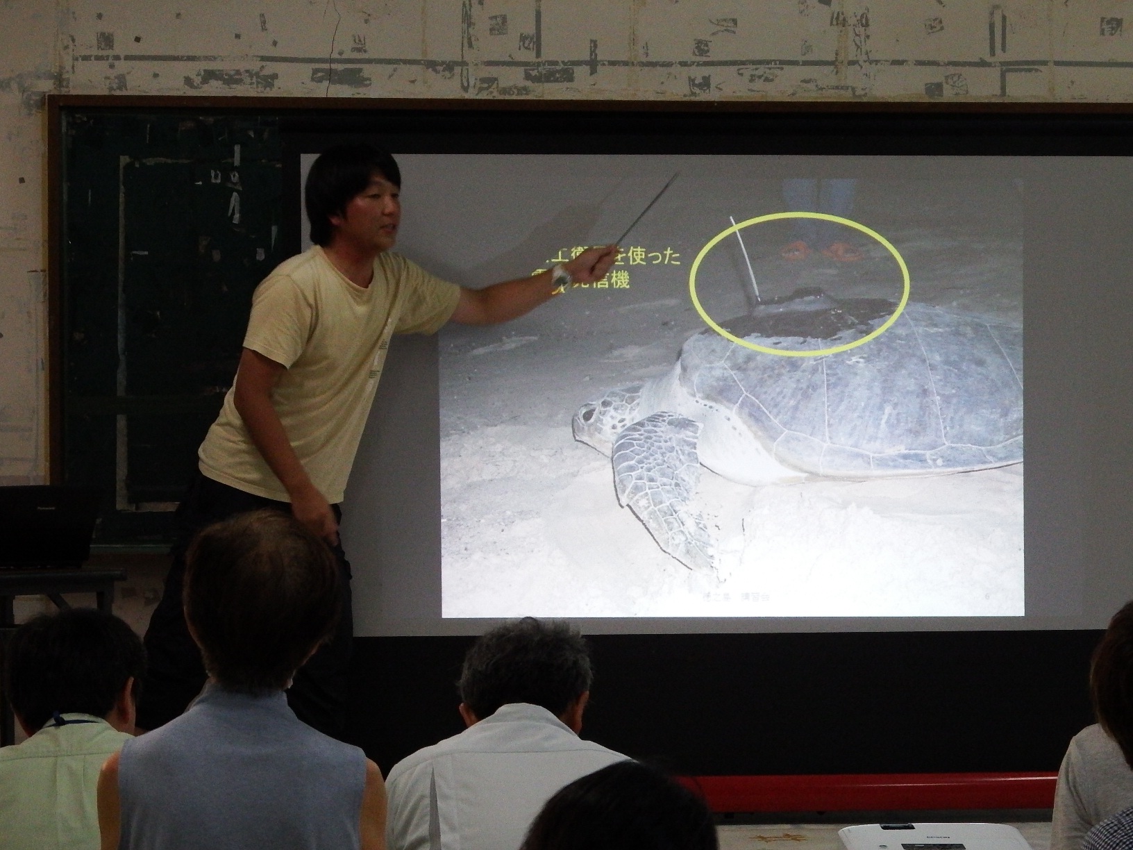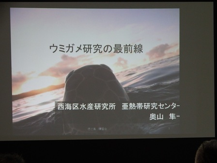 そんなウミガメをより身近に感じてもらおうと、今回は沖縄の最前線で研究に携わっている水産総合研究センター西海区水産研究所の奥山先生を講師にお招きし、ウミガメの生態や近年の研究結果などを講演していただきました。