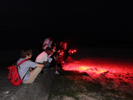 ウミガメの観察を行う際には、光に敏感なカメに刺激を与えないよう赤いライトを用いることなど、ウミガメ観察の際の注意点やマナーなどもみんなで勉強しました。