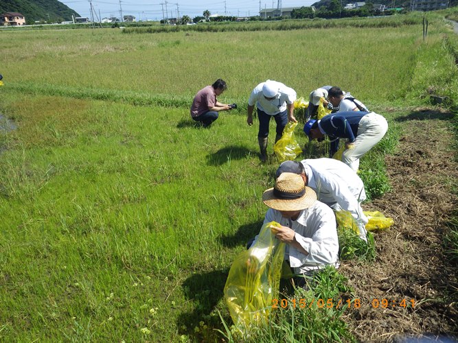 3枚の田んぼに突如として現れたボタンウキクサを踏みつぶさないように気をつけながら一つずつ丁寧に駆除しました。実際に田んぼに入るとまだ数ミリのボタンウキクサも見つかり、太陽がさんさんと降り注ぐ中それらを見つけ出し駆除するのはなかなか骨の折れる作業でした。