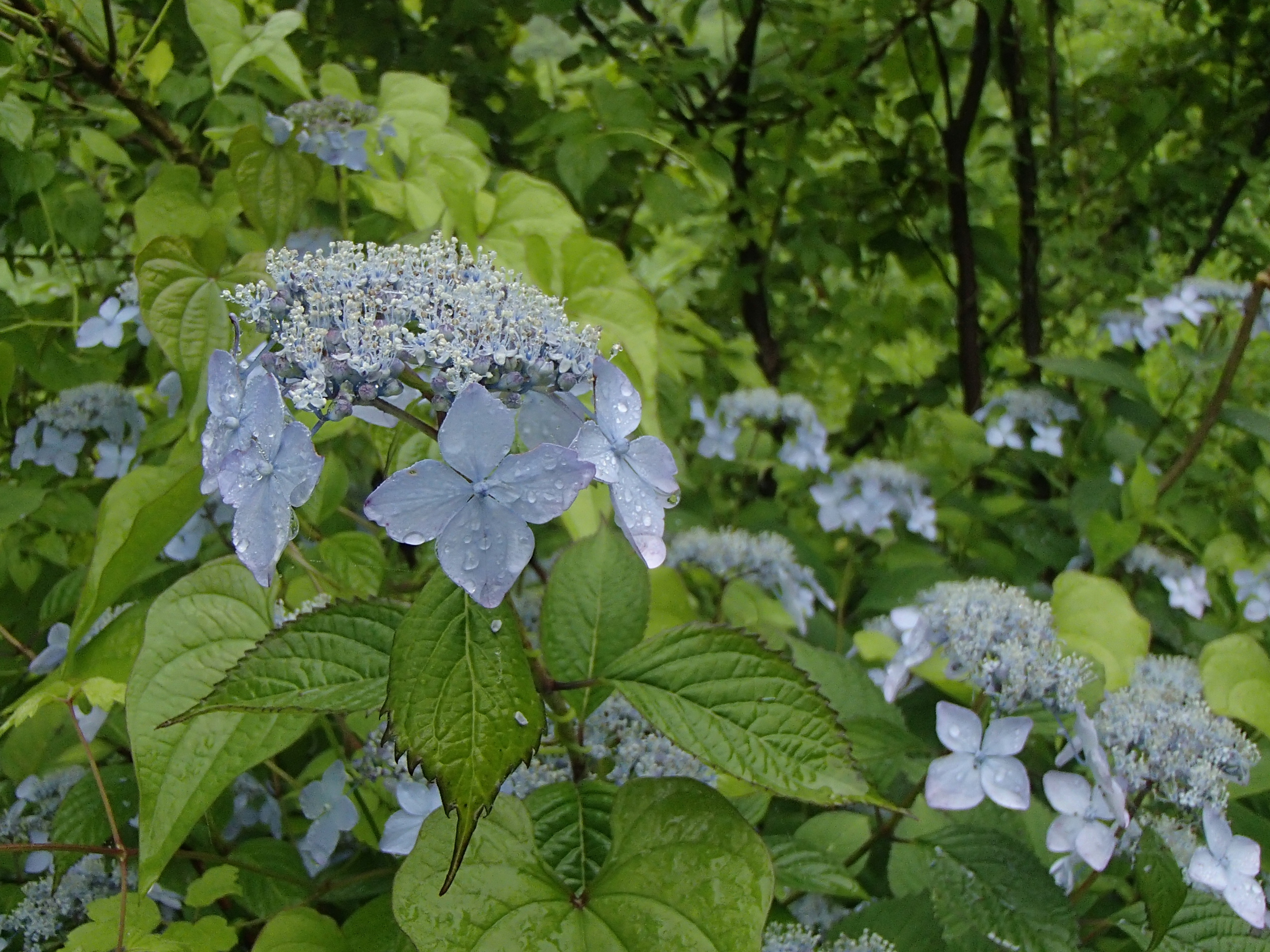 淡い青色がとてもきれい。大きく花びらのように目立つ花は見せかけの花(装飾花)、装飾花に囲まれるように小さく集まっている一つ一つが本当の花なのです。