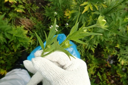 今回の作業では主に種子散布を抑制することをメインに考え、咲く直前の蕾を採ってしまうことで花をつけさせない駆除方法を、根堀りと合わせて取りました。作業方法としては、タデ原湿原側から横一列に並び、道路側までオオハンゴンソウの花芽を摘んでいき、ゴミ袋に詰めていきました。