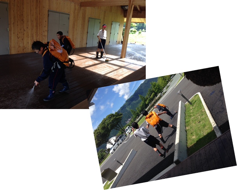 最終日の5日目は、ジェットシューター(野焼きの時に延焼を防ぐために使う背負い式放水器具)を使って、ウッドデッキの掃除のはずがいつのまにか・・・、服がビチョビチョに・・。