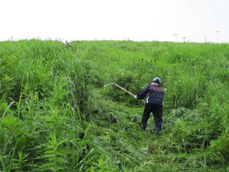 期間中はお天気に恵まれたので、草原に出向いて作業を手伝ってもらいました。まずは、翌週に予定している地元小学生の草原学習の下見に行ったり、阿蘇グリーンストックが管理しているトラスト地で昔ながらの大ガマを使った草刈りをしました。