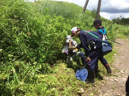 草原は夏の花の「ユウスゲ、アカショウマ、オカトラノオなど」が花盛り。それらに飛んでくるチョウチョや昆虫も多く見られました。チョウチョの名前には「○○シジミ」が多くついていることに驚いたり、すばしっこい「ハンミョウ」を捕まえては、鮮やかな色合いに驚いたりと発見の連続だったようです。