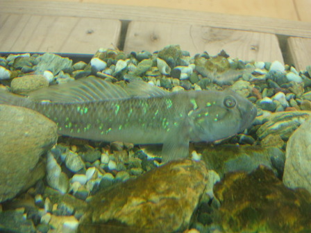 灰褐色の体にきらきら光る斑紋があり、日本では沖縄島の干潟だけにすむ貴重な魚。