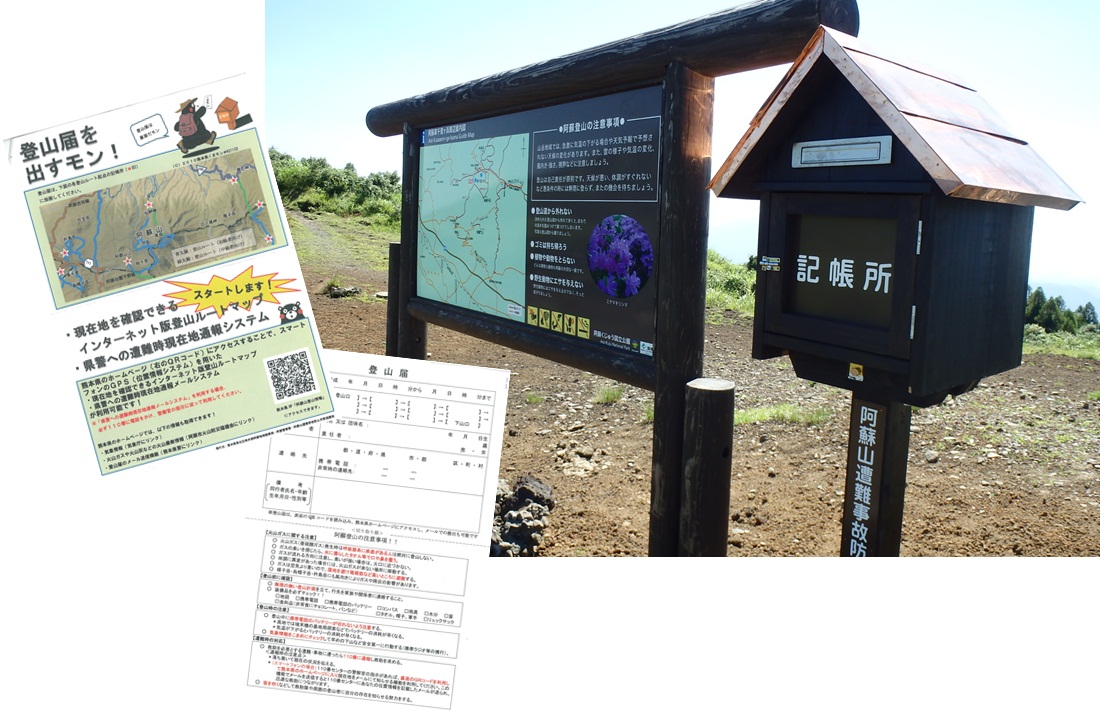 また、『登山届け記帳所』が、烏帽子岳・杵島岳の登山口に設置され、登山届けを提出してもらえるよう、新しいシステムの紹介と裏面には登山届けがついたチラシも作成し、記帳所に置いてあるので、登山の際には必要事項ご記入の上投函ください。