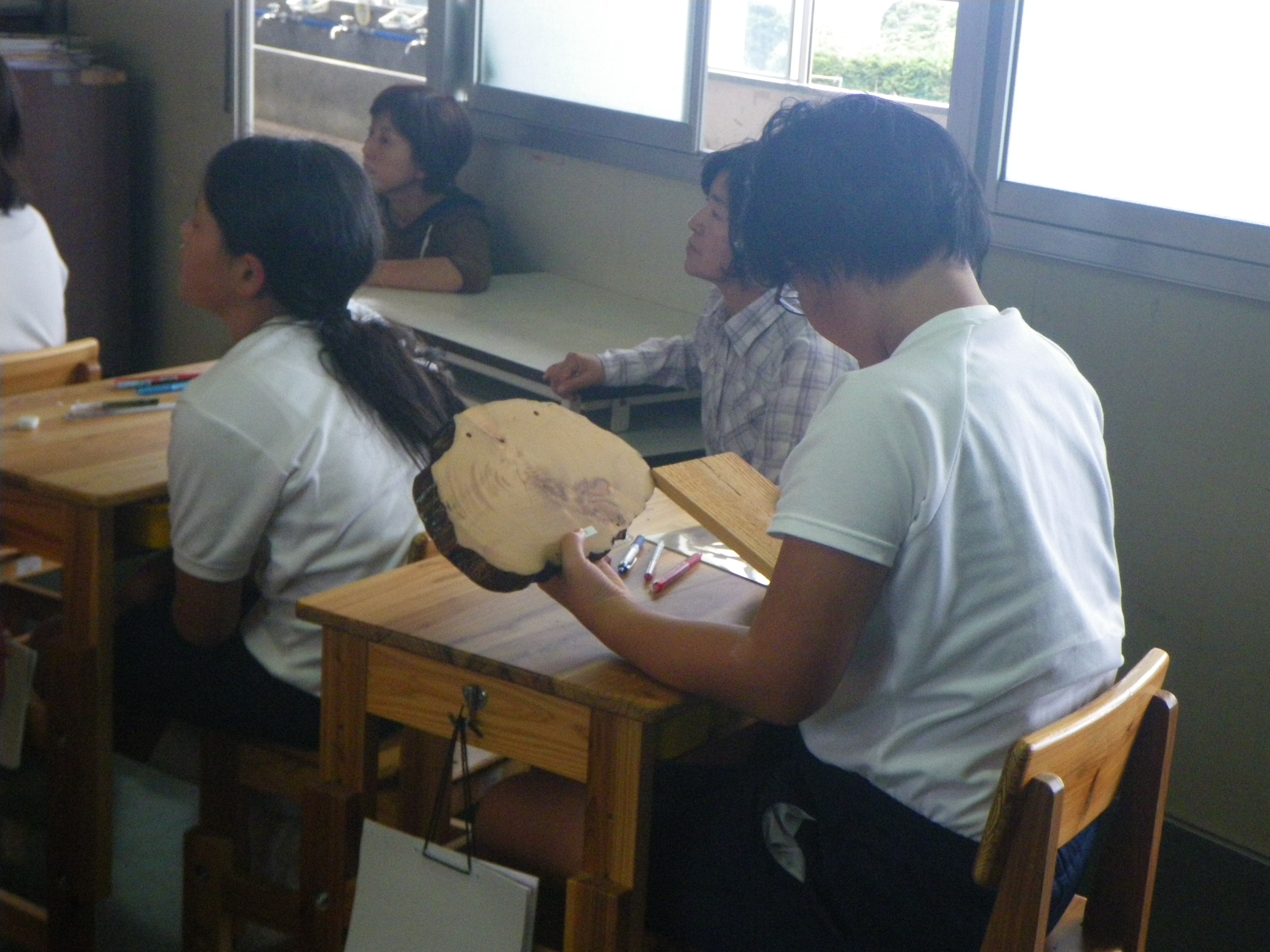 今回の授業では、ヤクスギと普通のスギの板を持参して、年輪がどれだけ違うか見比べてもらいました。