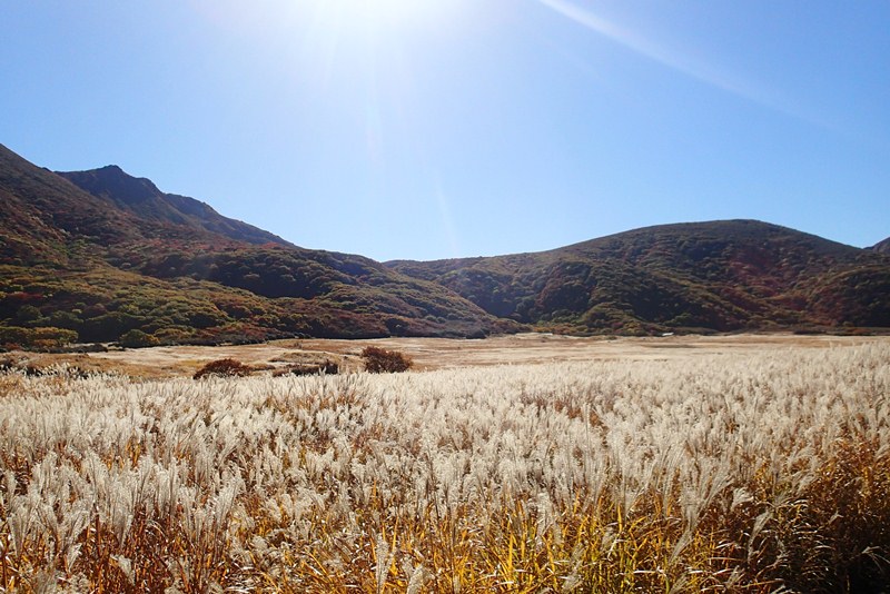 山頂から段原に向かっては、斜面一帯のドウダンツツジ群落の紅葉が見られ、遠くに見える坊ガツルではススキが黄金色にたなびき、見事な赤橙黄のコントラストでした。