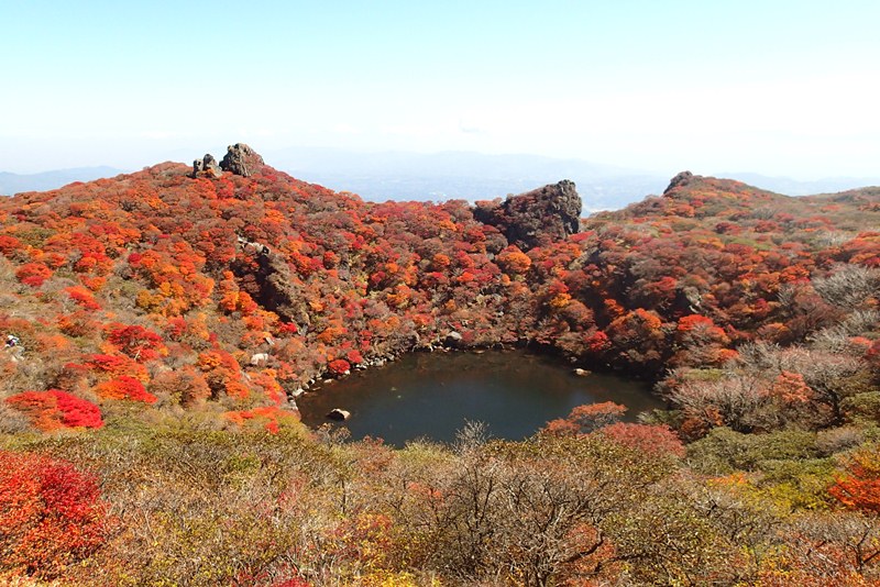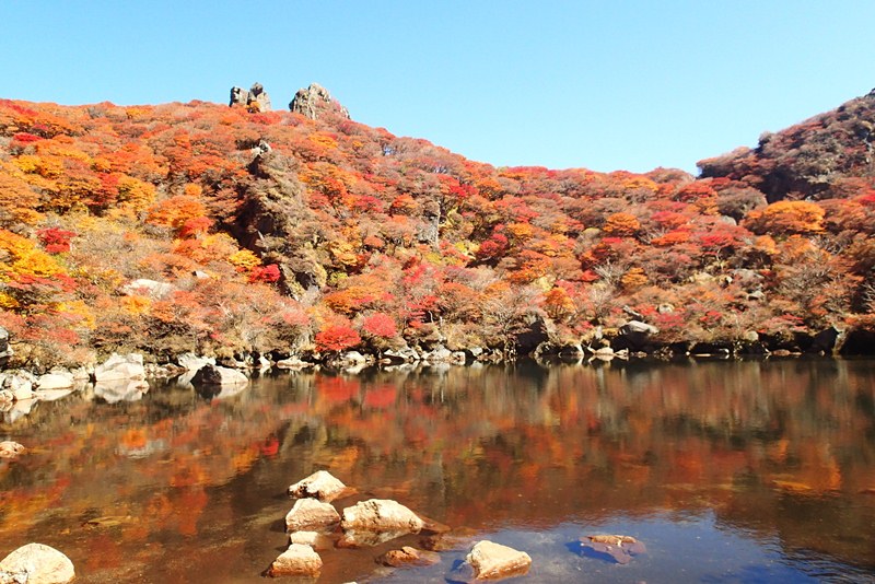 山頂直下の火口湖「御池(おいけ)」では空の青が紅葉の風景に加わり、それが水面に映り、風景と美しく調和していました。