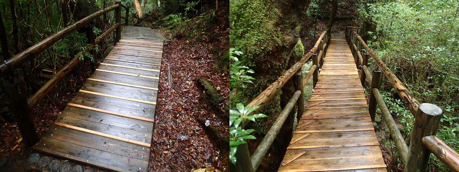 ▲付け替えた滑り止め板(左)とコケを落とした木道と手すり(右)。