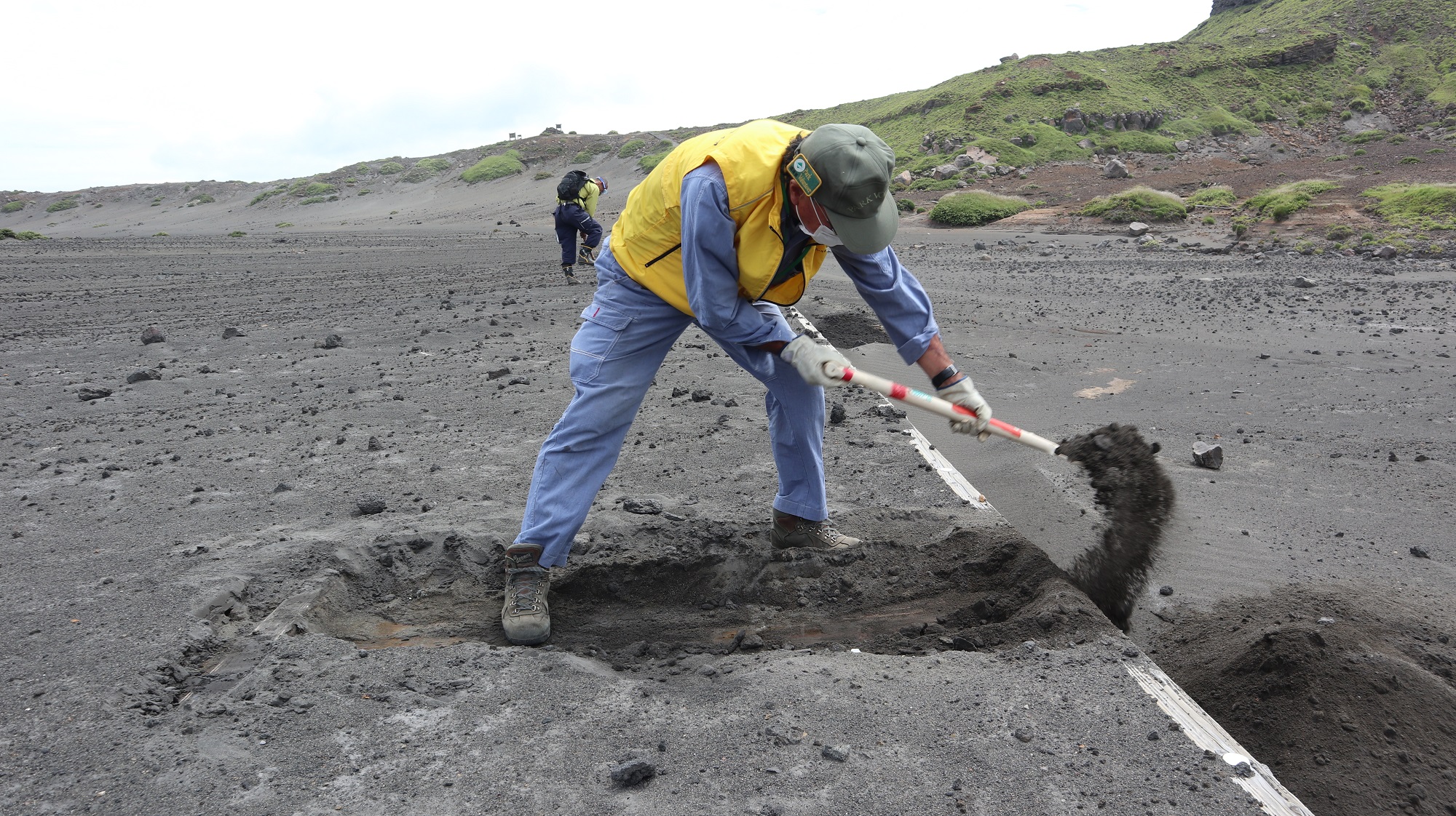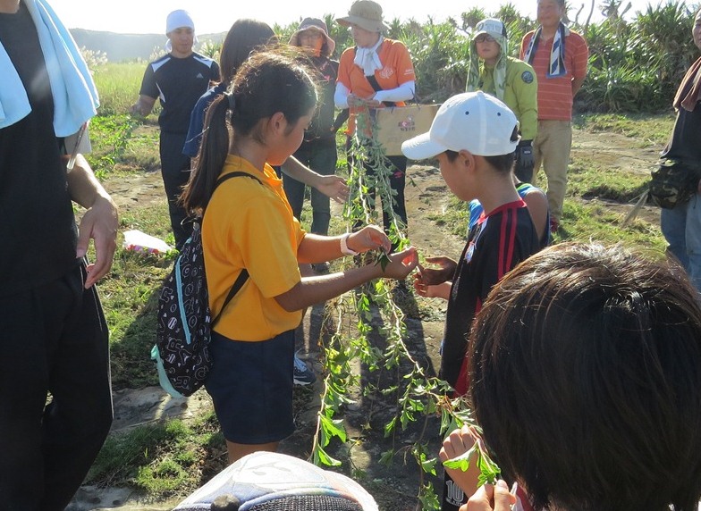 与那国島には外来植物のアメリカハマグルマが繁茂し、他の植物の生息環境を奪っています。そこで、現状を知ってもらうため参加したみんなにアメリカハマグルマの茎の長さを競いながら駆除体験が行われました。地面を覆うように成長するアメリカハマグルマの根を切らないように3m以上の茎をみんなが上手に駆除し、夢中になっていました。
