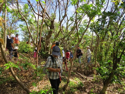 観察会では、まずヨナグニマルバネクワガタの生息環境を観察しました。地域の方でもなかなか林の中に入る人も少なく、こんな環境があったのかと驚かれていました。