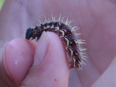与那国島の久部良岳(標高:191m)に登りました。大人たちは少しバテ気味の中、子供たちは久部良岳の山頂に続く急な坂道を元気よく走って登っていました。やはり子供は元気です。散策中、触っても刺されないアカタテハの幼虫を発見した子供たちは、刺さない毛虫に興味津々といった感じで、アカタテハの幼虫の感触や生態をじっくり観察していました。
