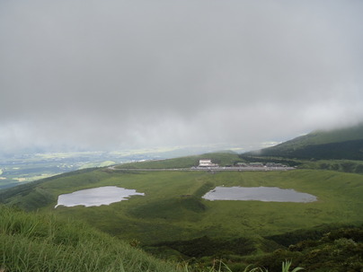 烏帽子岳の裾野にある草千里は、約2万7千年前に噴火した場所で、2つある水たまりの西側が最初の噴火の火口跡で、東側がその後溶岩ドームを吹き飛ばした時の火口跡になります。山頂から見下ろすと「人の顔」のようにも見え、芸術家の岡本太郎氏が「太陽の塔」を制作する時のモチーフにしたという話しも聞かれます。