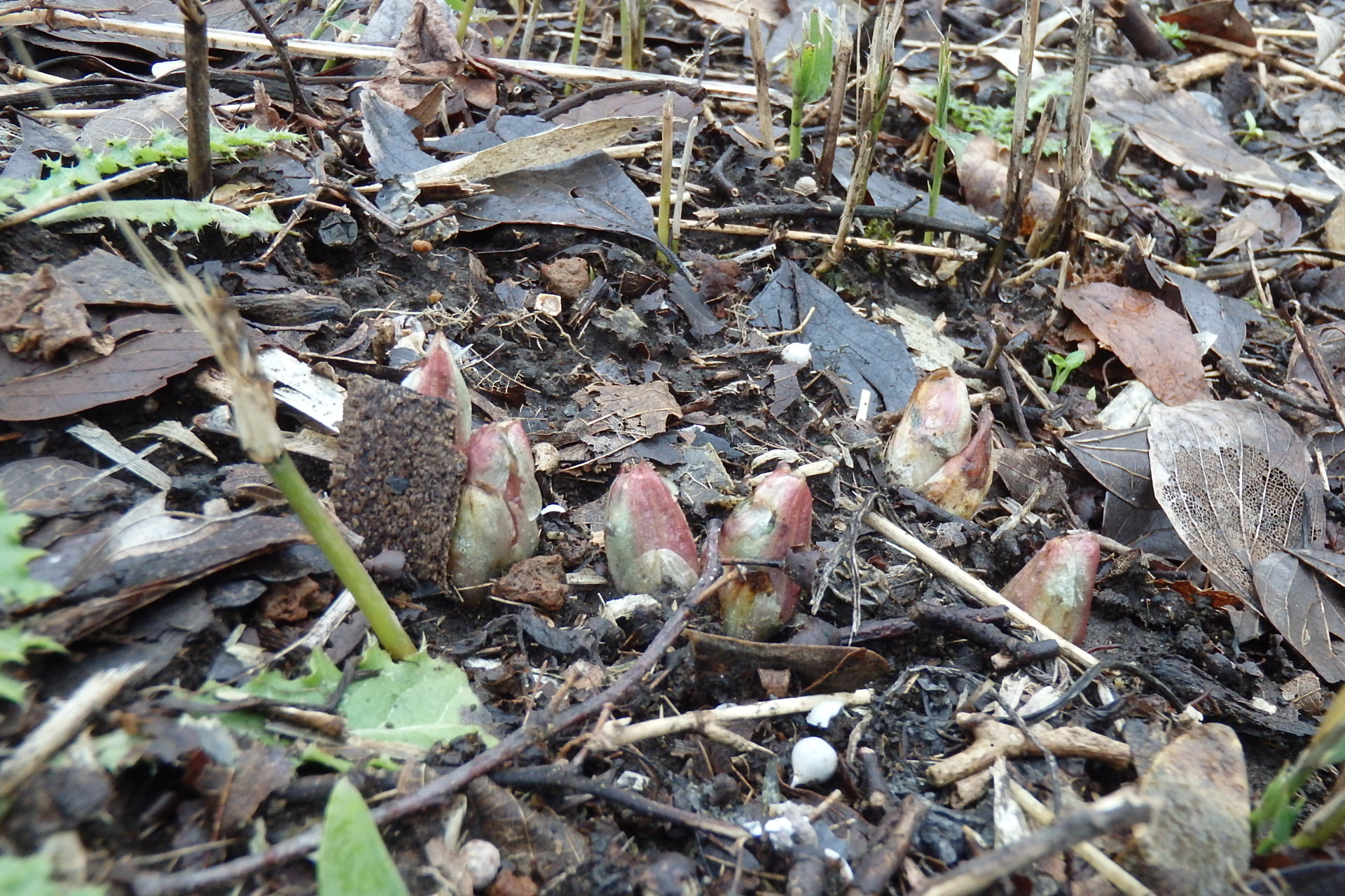 この時期、林床からニョキニョキニョキ・・・このつぼみ、なんの花が咲くでしょうか??