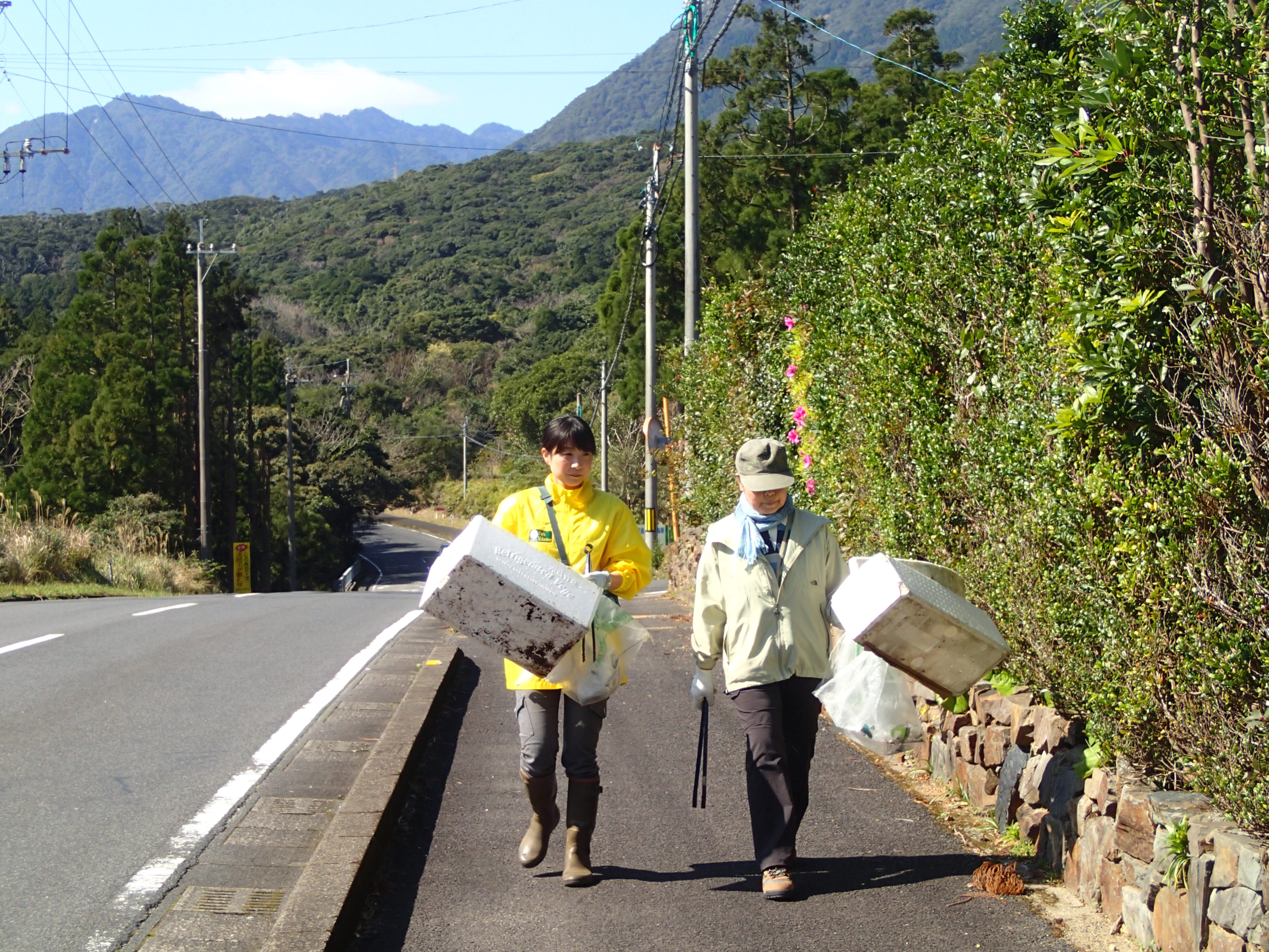 最後の活動は、二手に分かれて屋久島の県道(安房地区~小瀬田地区間)沿いのゴミ拾いを行いました。