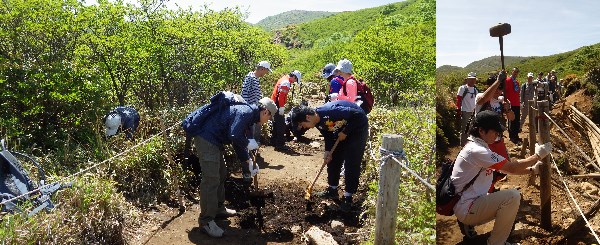 先日、本格的な登山シーズンを前に、九州電力主催の登山道整備が行われました。ロープを張り直したり、雨が溜まりやすい場所に水が流れるように溝を作ったりしました。雨が降るとぬかるんでかなり足場の悪くなる道が、少し歩き易くなると思います!