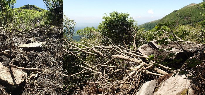 右:大きな石が落ちてきて木がなぎ倒されている
