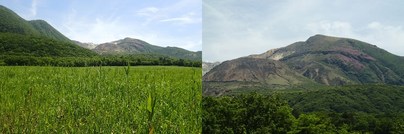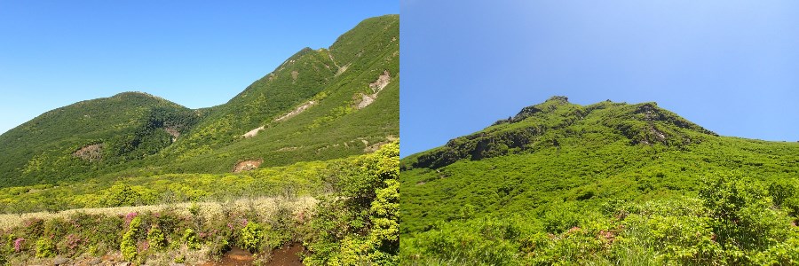 左:久住山山頂近くの岩場が崩壊し、谷に沿って崩れている(登山道の一部を押し流している状態)