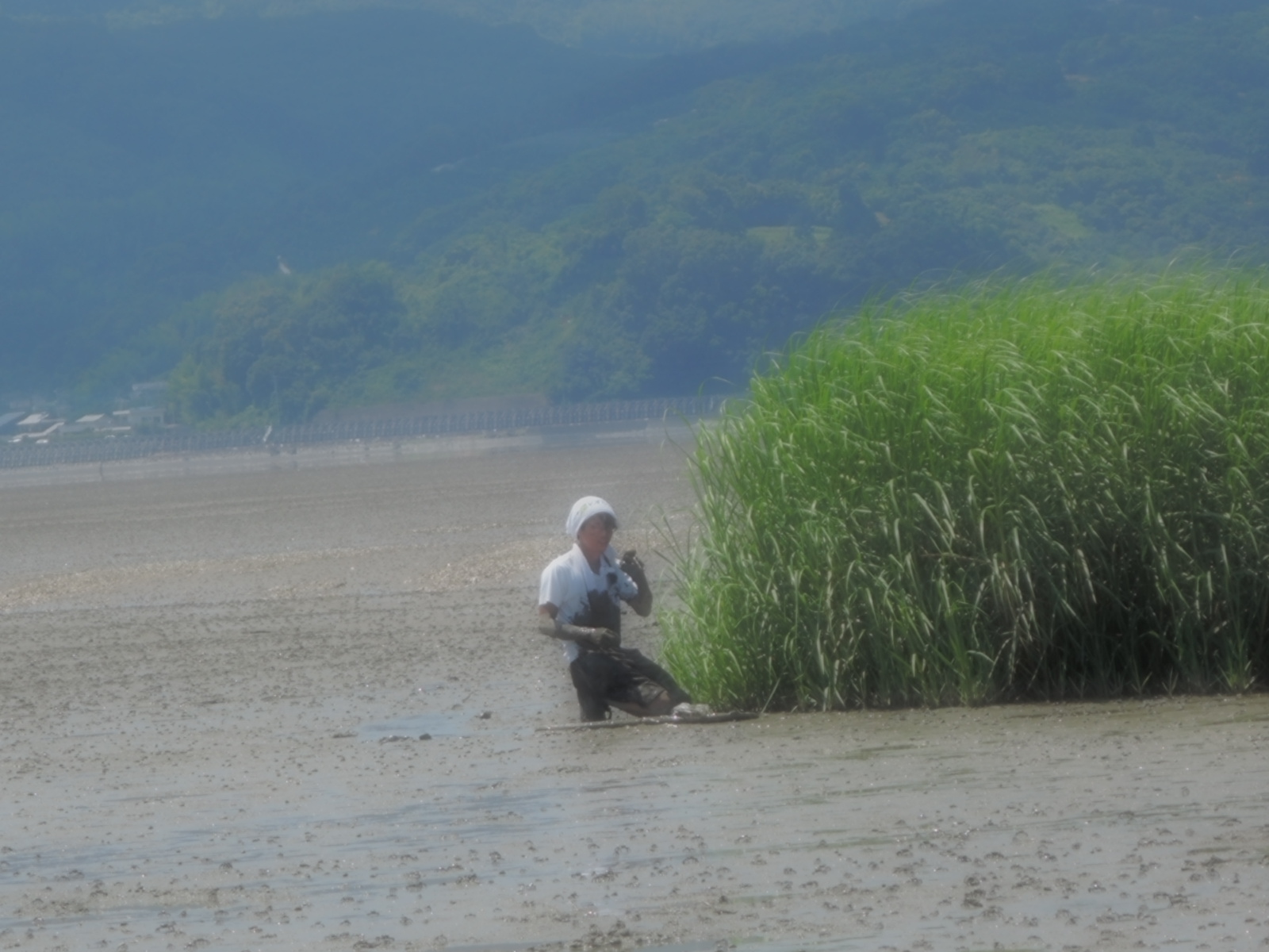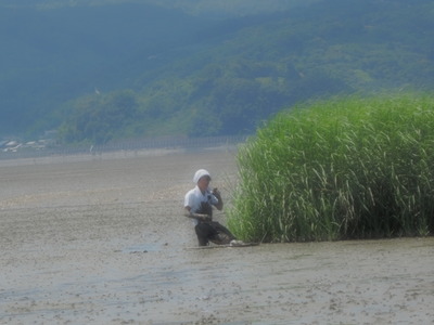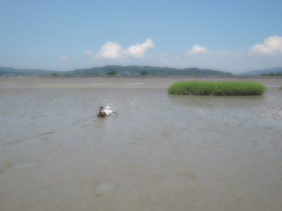 ボディーボードに乗り、干潟の上を緑の塊に向けて横切っている青年の姿、何とも面白かったです。