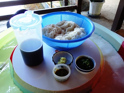 そして今こちらの流し素麺屋さんの方式は、真ん中にある丸テーブルのまわりが丸く囲まれていて、いつのまにかそこに湧水がわき出てきて回り始めます。そこに素麺を流して食べるのです。湧水とテーブルをつないでいるのでしょうね。お店の池ではニジマスも沢山泳いでいます。薬味はネギとわさびだけでなく、島原半島特産のゆず胡椒もでてきます。ゆず胡椒の中身も知らなかった私ですが、こちらの新鮮な手作りの味を知ってはまっています。ゆず胡椒と流し素麺ははじめて食べましたが、最高に合います。この組み合わせ新しくないですか?