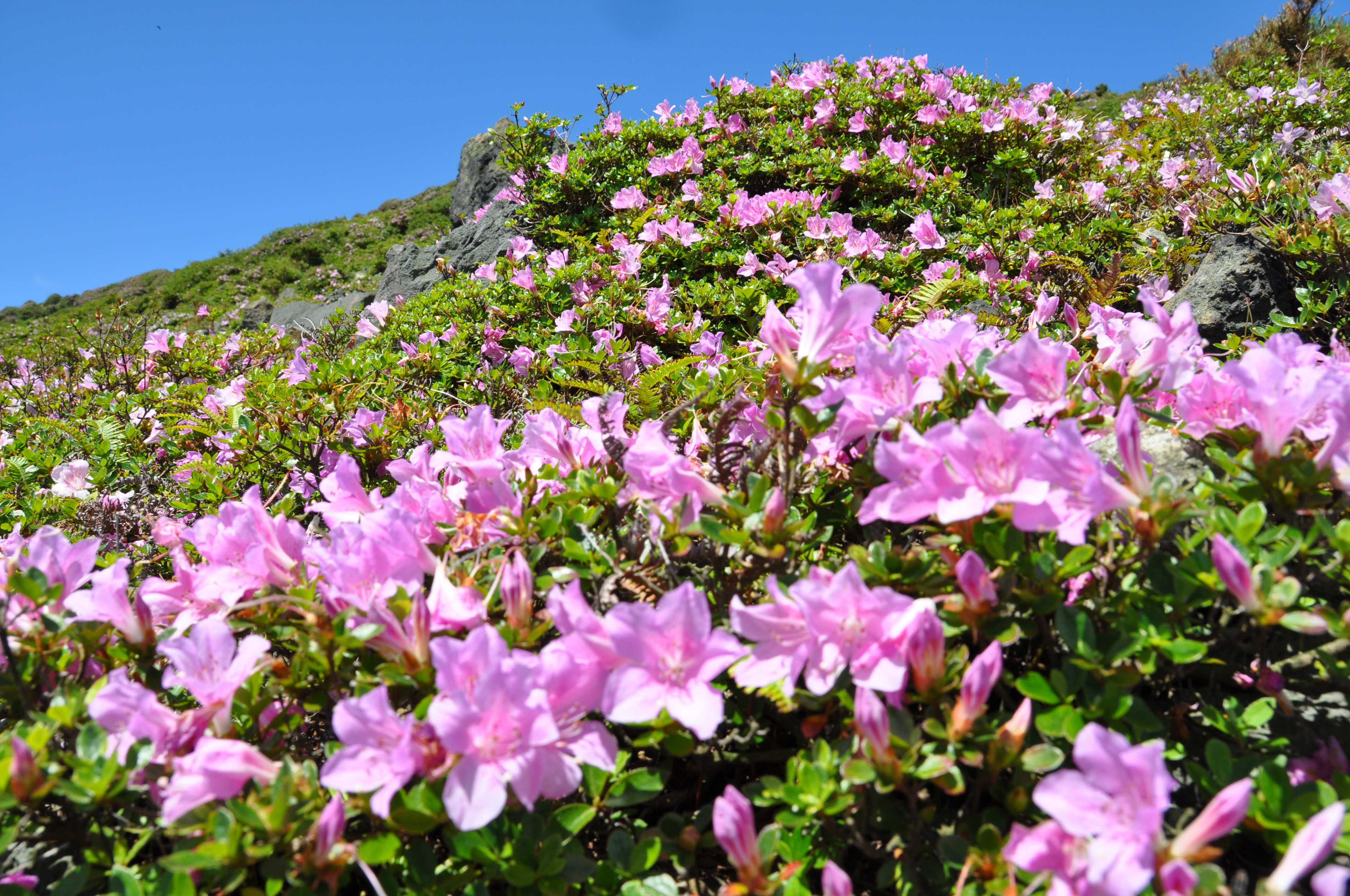例年初夏に口永良部島の山肌を鮮やかなピンク色に染めるマルバサツキ(島ではエラブツツジと呼びます)の状況ですが、登山道方面の花は無事のようです。