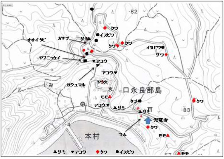 ▲エラブオオコウモリ観察マップ(オオコウモリが利用する樹木)。