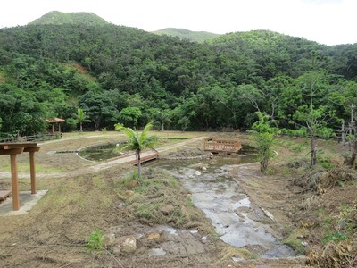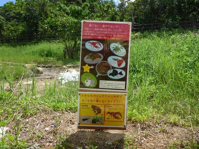 そういった事態を避けるため、親水広場の入口と池の周辺には、アメリカザリガニ等を捨てない、逃がさないことを周知する立て看板を設置して注意喚起を行っています。また、人力での定期的な捕獲作業に加え、施設を管理している石垣市と調整しながら、池に流れる水をせき止めて、汲み上げ式ポンプで水を枯渇させて防除する方法を行っているところです。