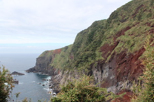 嵯峨島漁港を北方向へ進むと、海沿いにアコウの木があります。アコウはクワ科の亜熱帯性植物で日本では紀伊半島以南に分布していますが、火山の噴出物が堆積して縞模様になった凝灰岩の崖にアコウの気根が複雑な文様を描いて張り付き垂れている様子は火山島・嵯峨島ならではの特異な景観です。