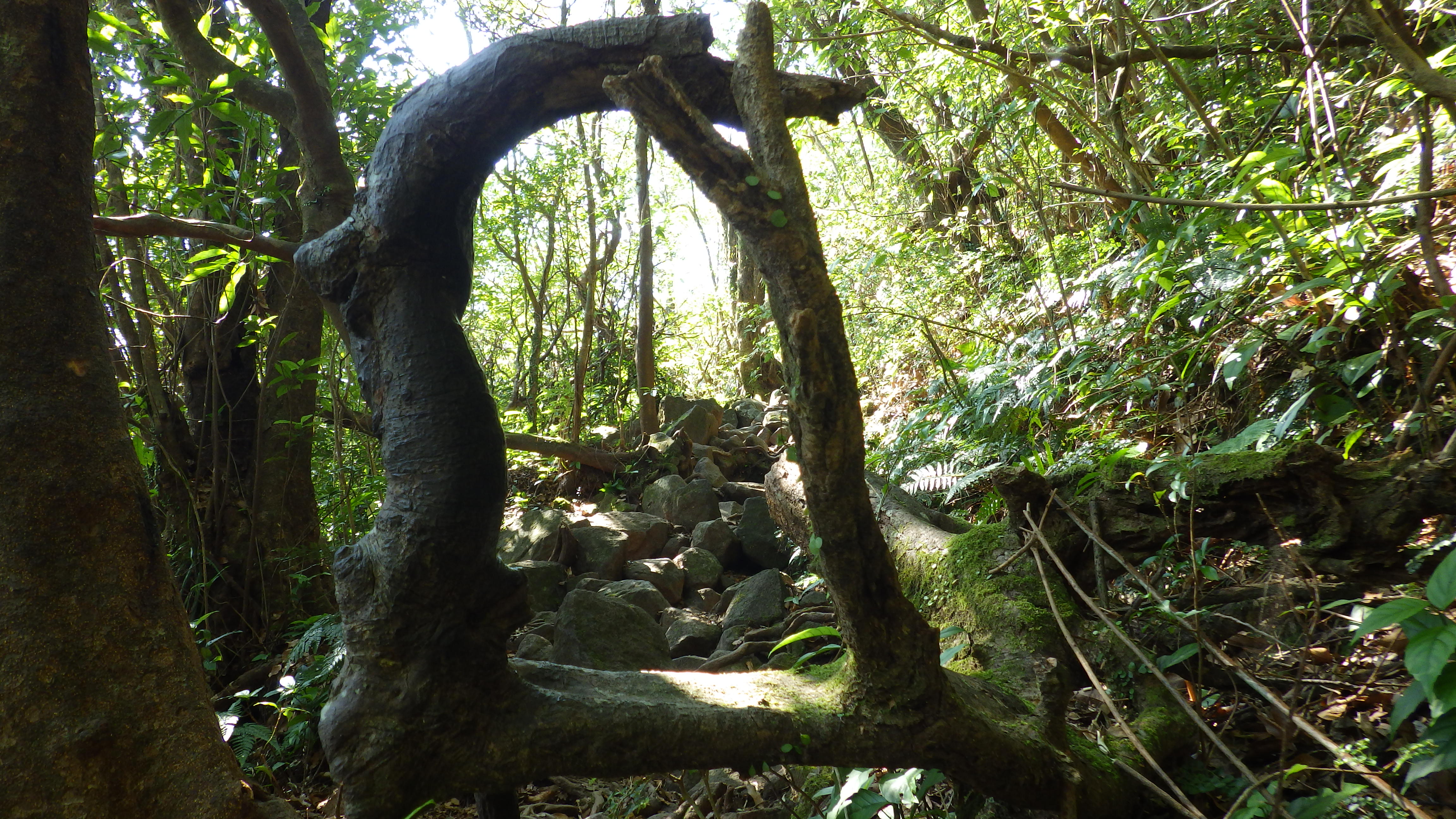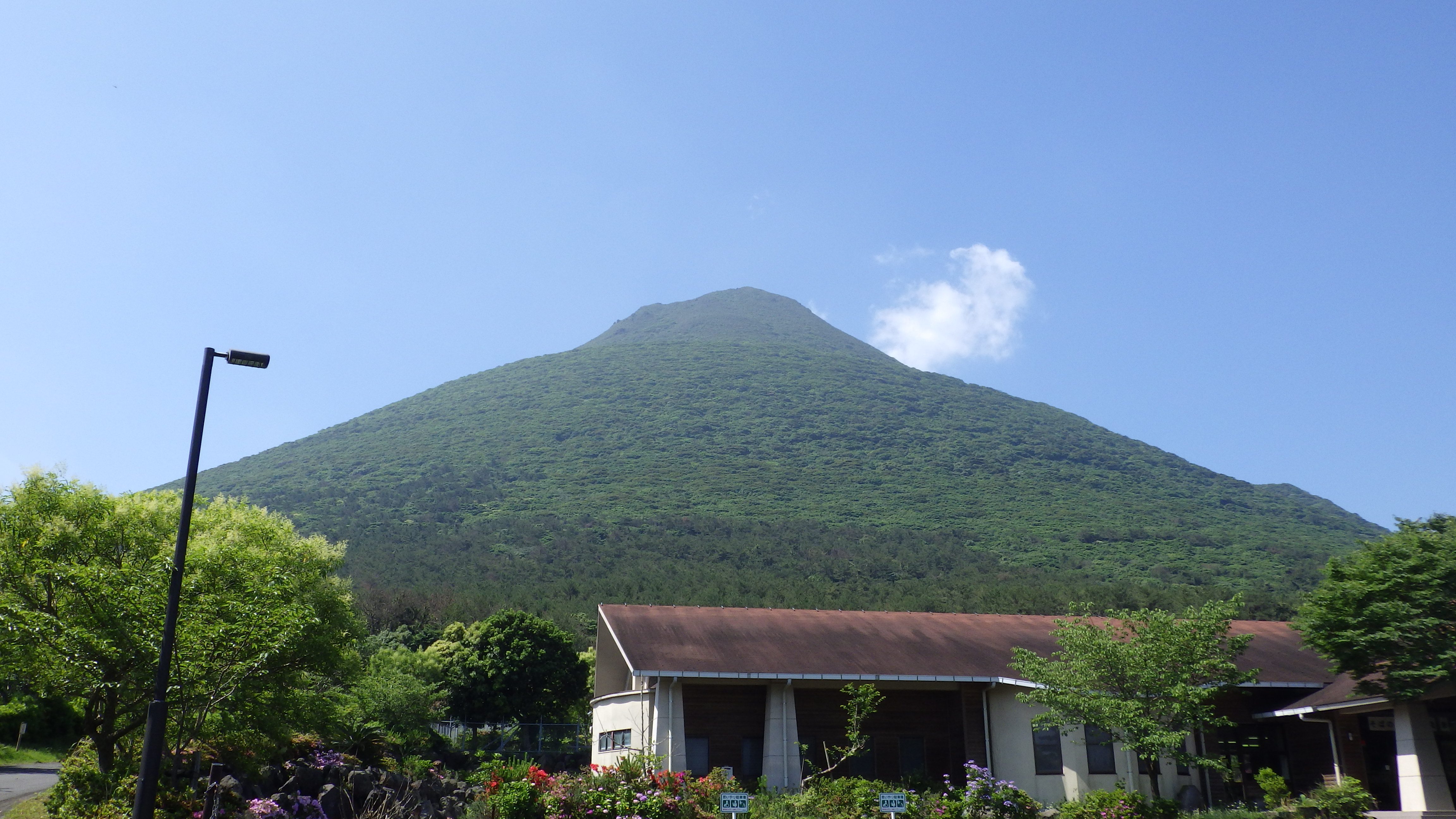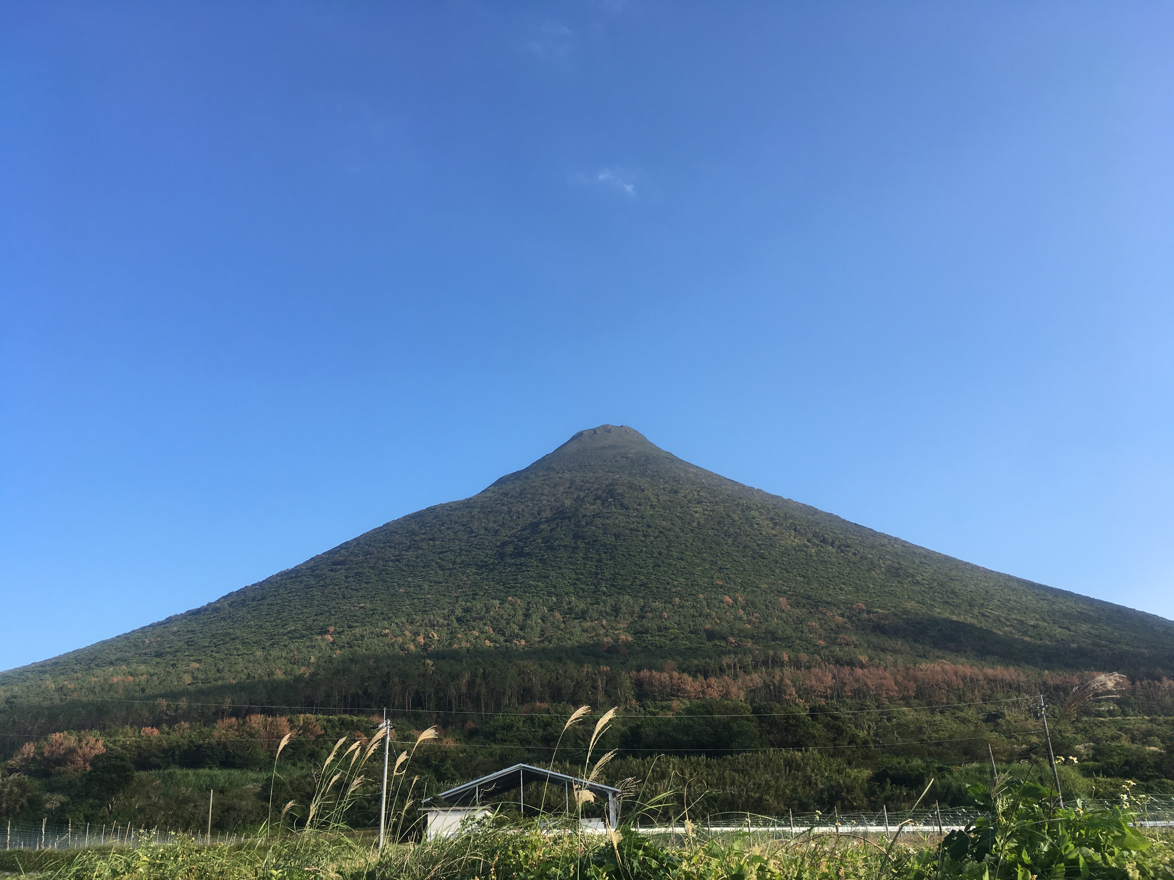 開聞岳はきれいな円錐の形をした、一見とんがり帽子のような山ですが、2回の噴火を経て現在の形になった2段式火山です。1回目の噴火が約4000年前。2回目の噴火が約1000年前。よく見ると8合目付近にボコッとした境目があり、麓の方と山頂では地質も異なります。