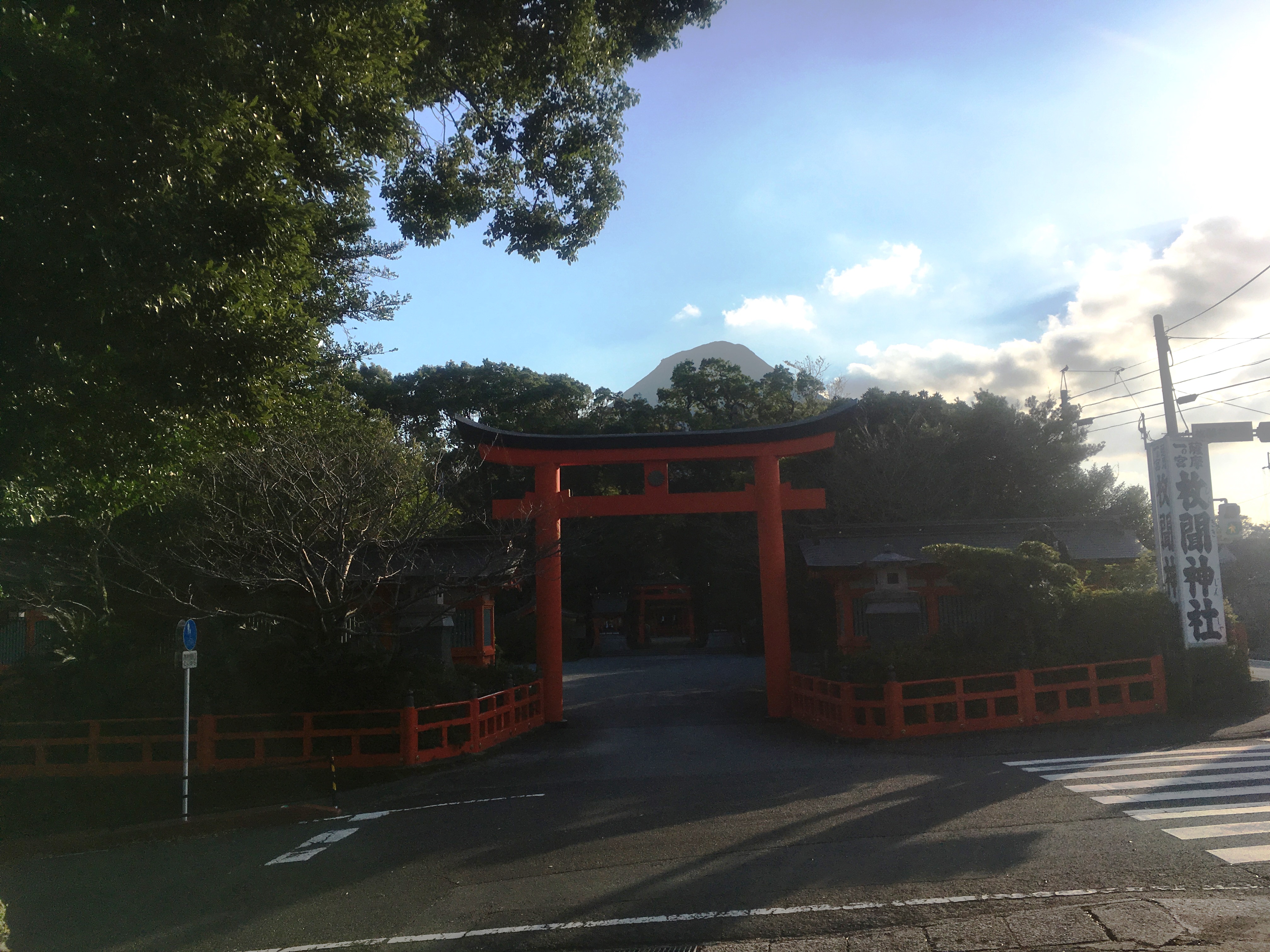 【山頂の御嶽神社】 【後ろに開聞岳の頭が見える枚聞神社】