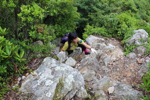 旧七嶽神社奥殿へ続く参道は、石段を登るほどに間隔や奥行が狭くなるため1段1段足元を確かめながら進みます。父ヶ岳登山道との分岐点から七ッ岳山頂方向へ暫く登ると左右が樹林に覆われた比較的歩きやすい道が続きます。単調な道ですが、地面や岩肌をよく見ると見逃してしまいそうなくらい小さなシダ類・ラン類等の葉が見つかることもあります。今では九州百名山に選ばれたこともあり登山者も多くなりましたが、昔はミサゴの巣を山頂に近い岩壁で確認できたそうです。
