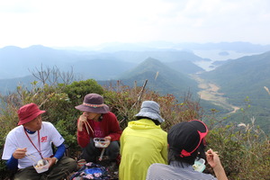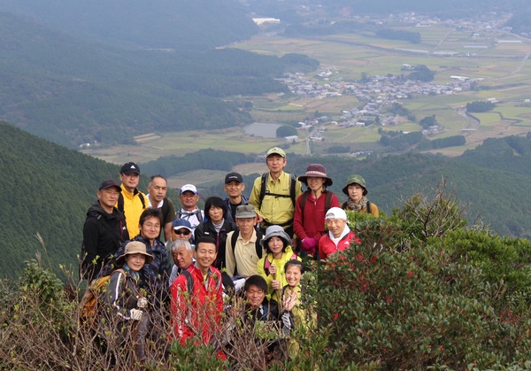 七ッ岳は、岩場登りや稜線歩きが中腹あたりから続きます。ここ最近少しずつ朝晩の気温が下がるものの日中は秋らしい清々しい日差しも射すため、登り道では羽織っていた上着を一枚脱いだり、袖をまくったりと衣類で調整しながら進みます。樹林に覆われた登山道から急に木々に隠れていた前方が開け、目指す山頂方向や玉之浦湾を見渡すことができ、参加者の中には初めて見る景色に歓喜の声をあげていました。