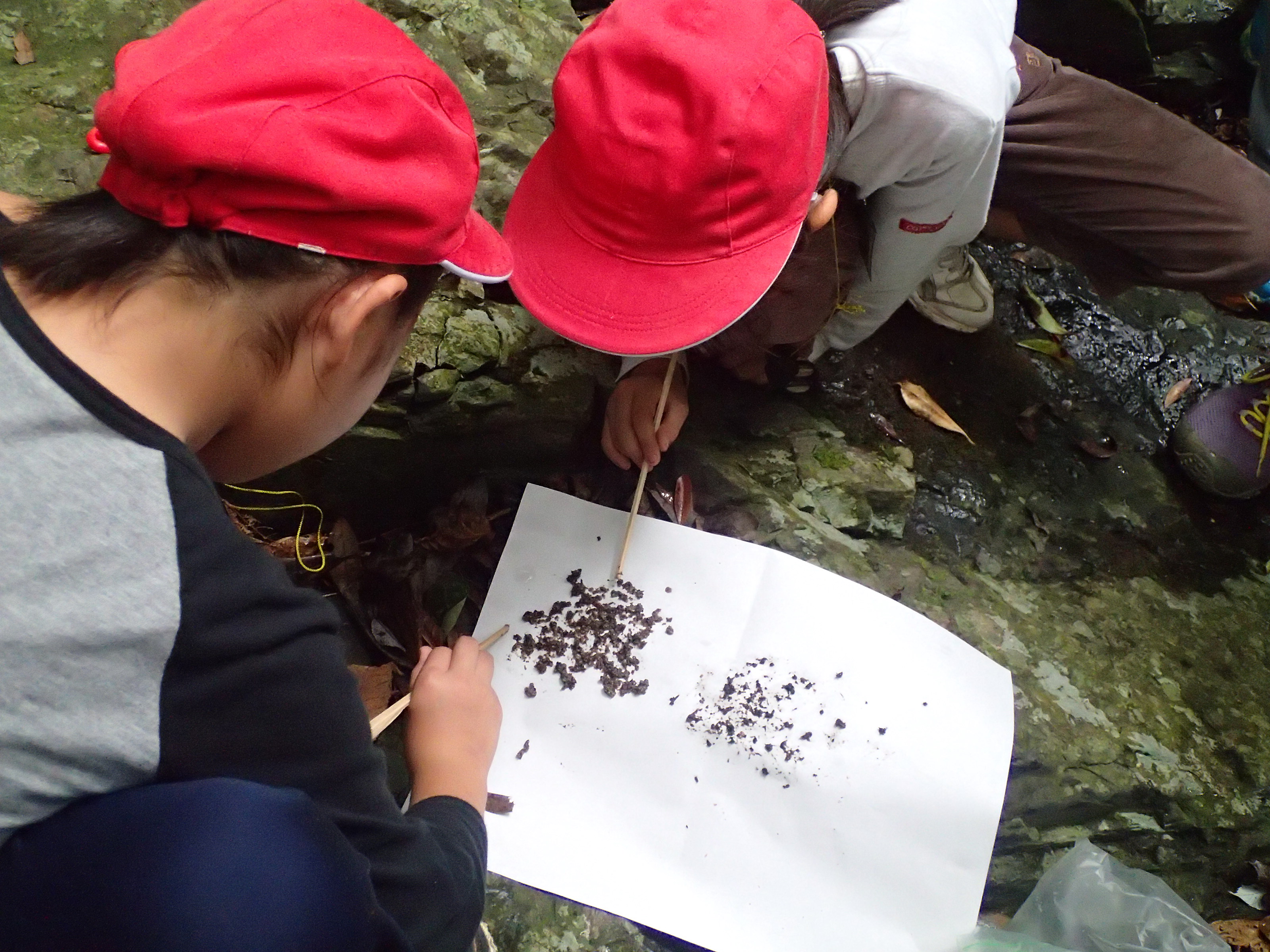 また、落ちているサルとシカの糞を拾って沢で洗い、内容物を比べてみました。