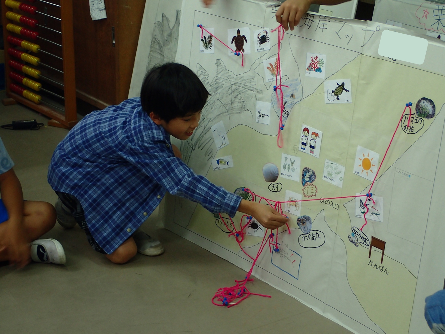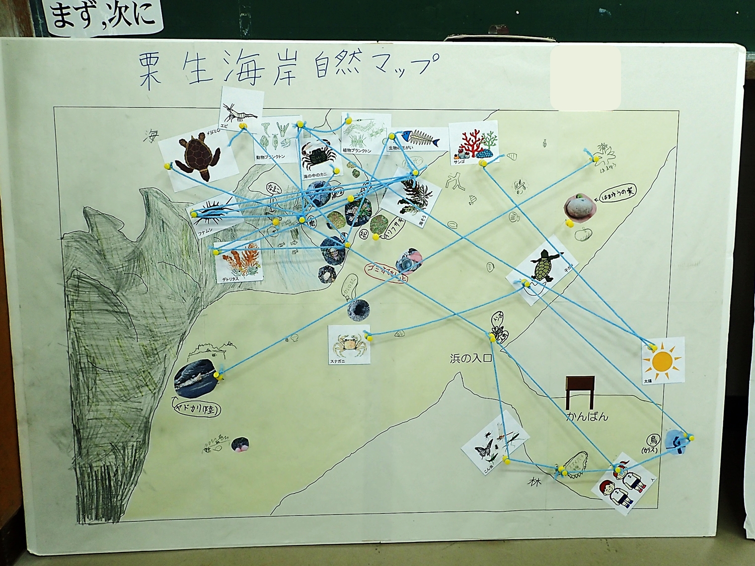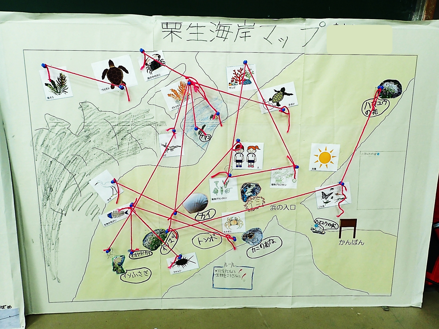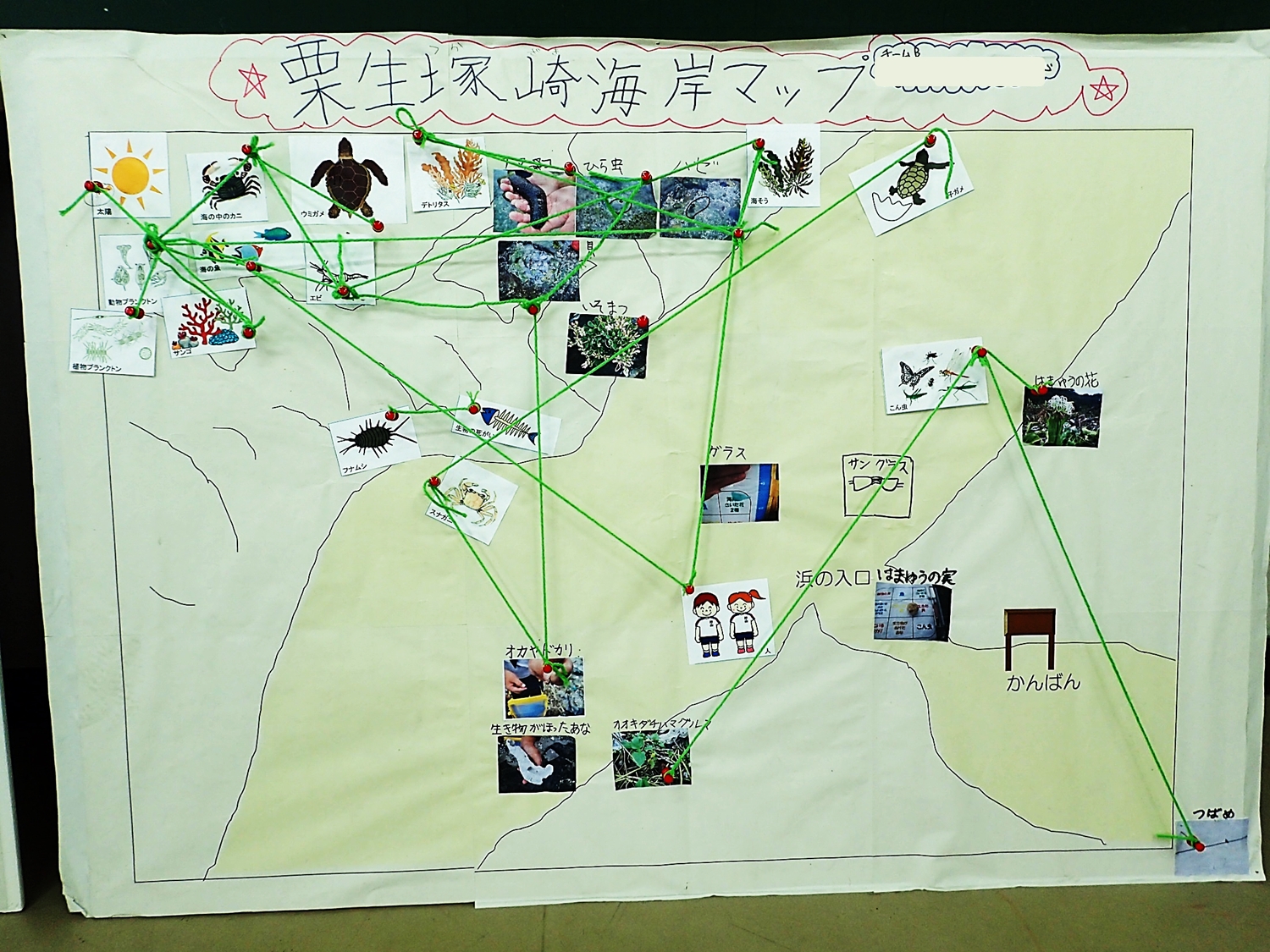 授業参観前の出前授業で栗生海岸へ行き、様々な生きものを見つけて海岸マップを作ったので、授業参観ではそのマップを使うことにしました。